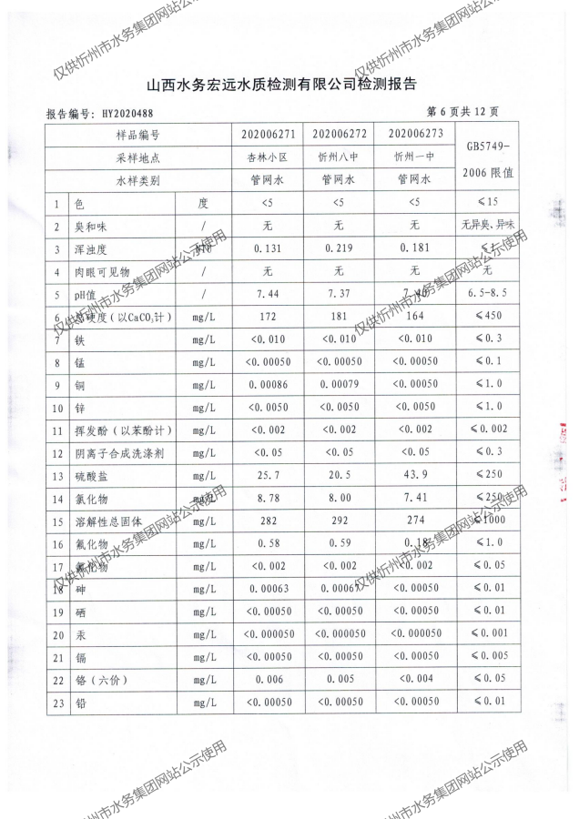 忻州城區公共供水水源水、出廠水、管網水、管網末梢水2020年7月份水質信息公示