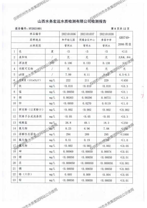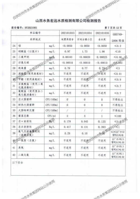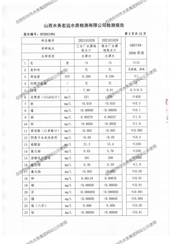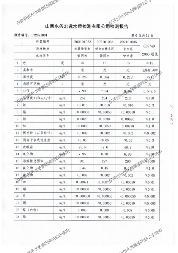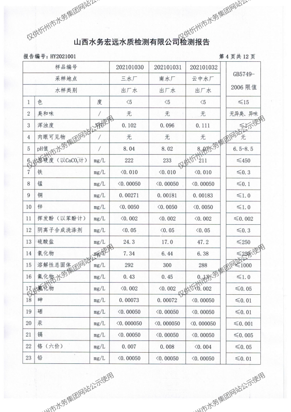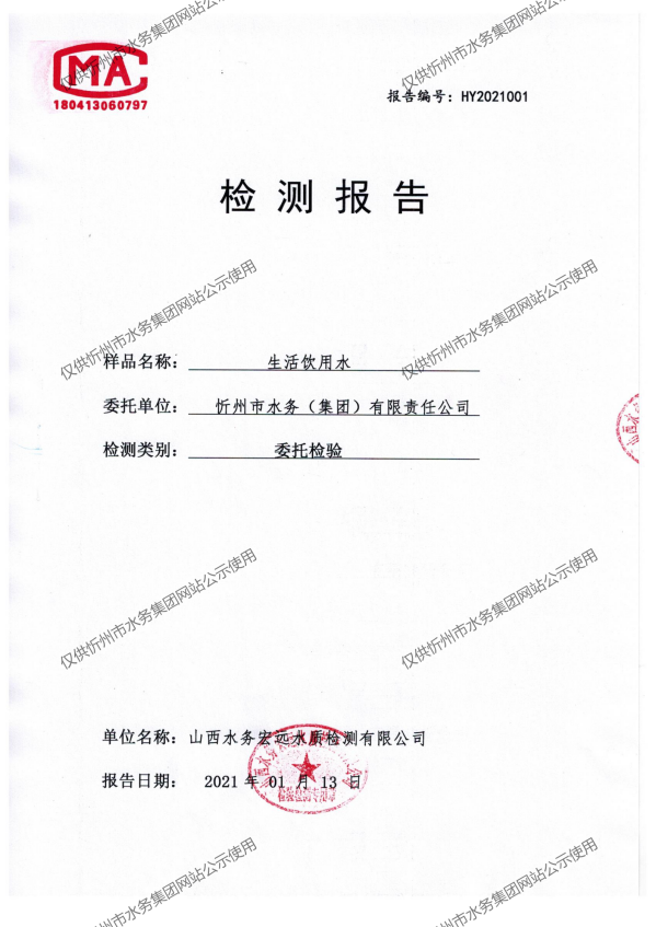 忻州城區公共供水水源水、出廠水、管網水、管網末梢水2021年1月份水質信息公示