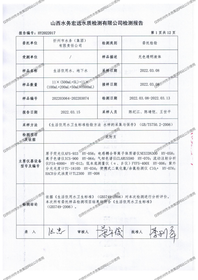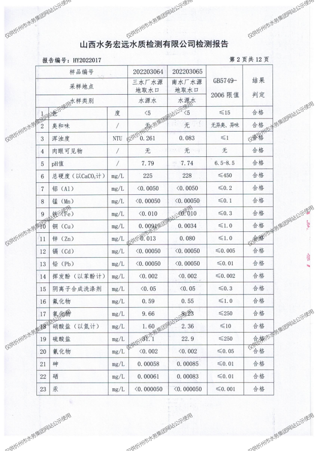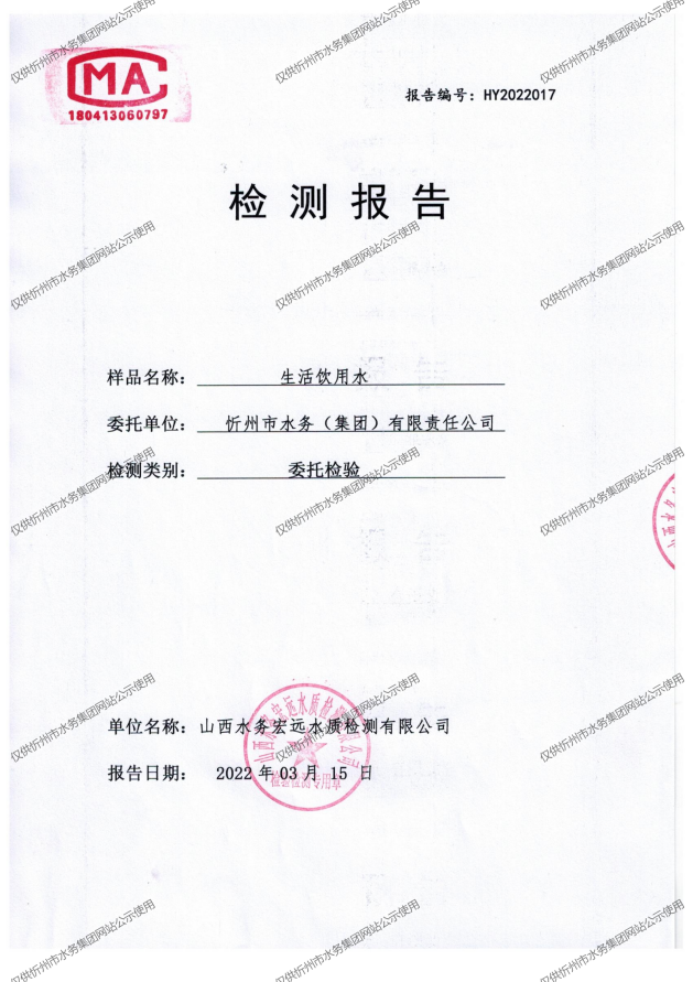 忻州城區(qū)公共供水水源水、出廠水、管網(wǎng)水、管網(wǎng)末梢水2022年3月份水質(zhì)信息公示