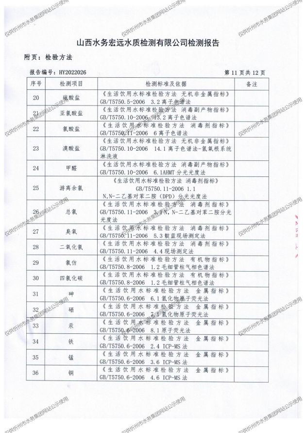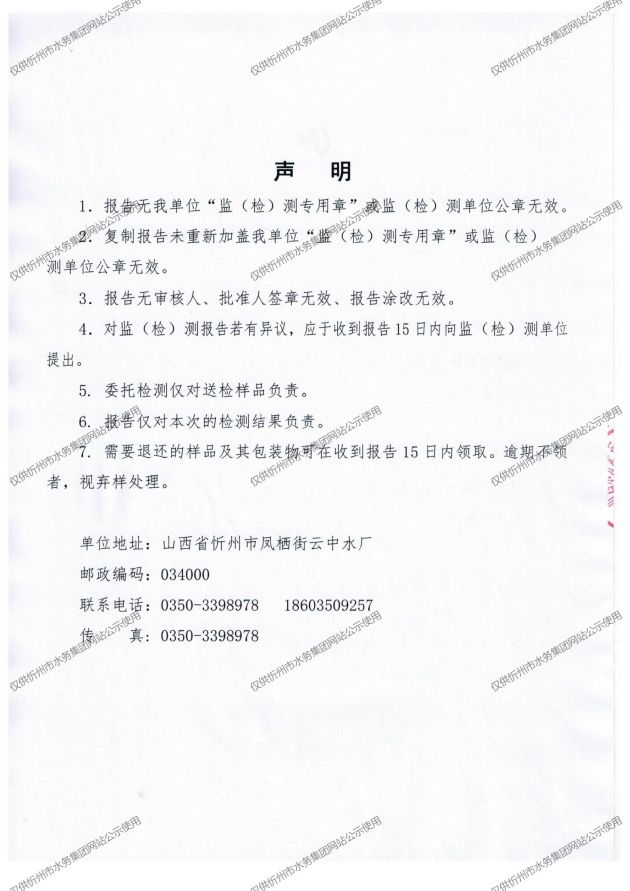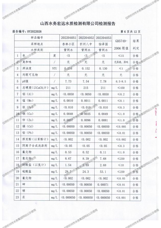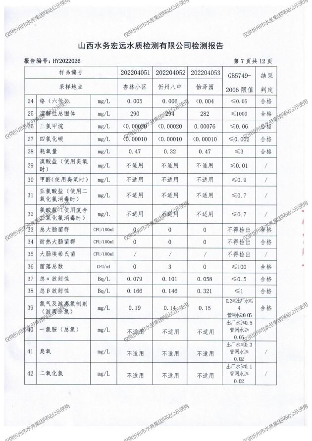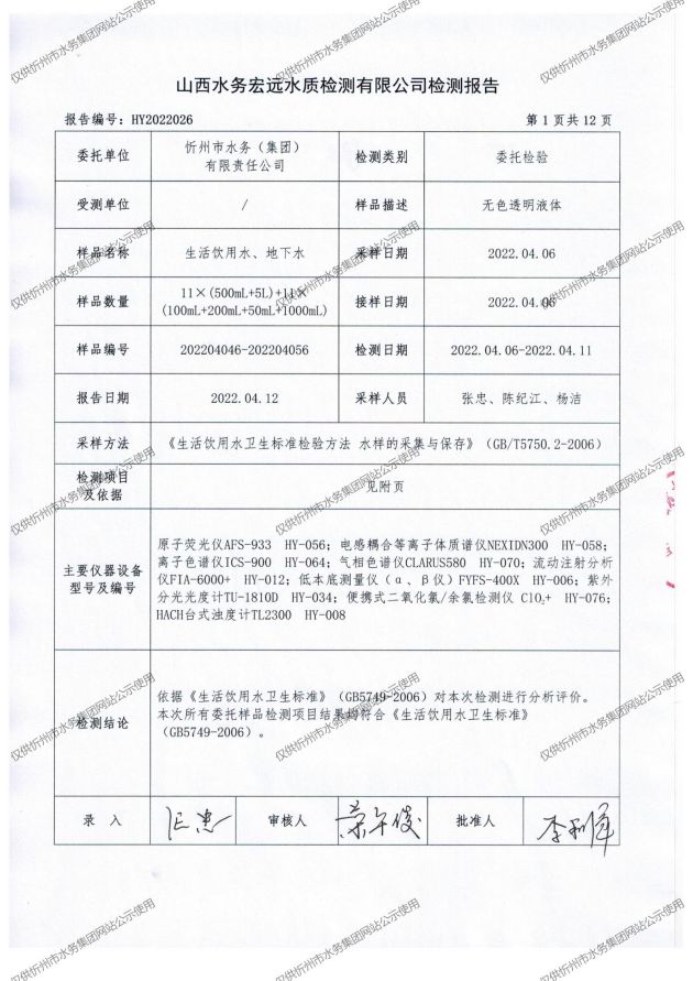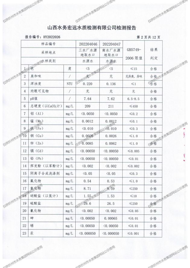 忻州城區公共供水水源水、出廠水、管網水、管網末梢水2022年4月份水質信息公示