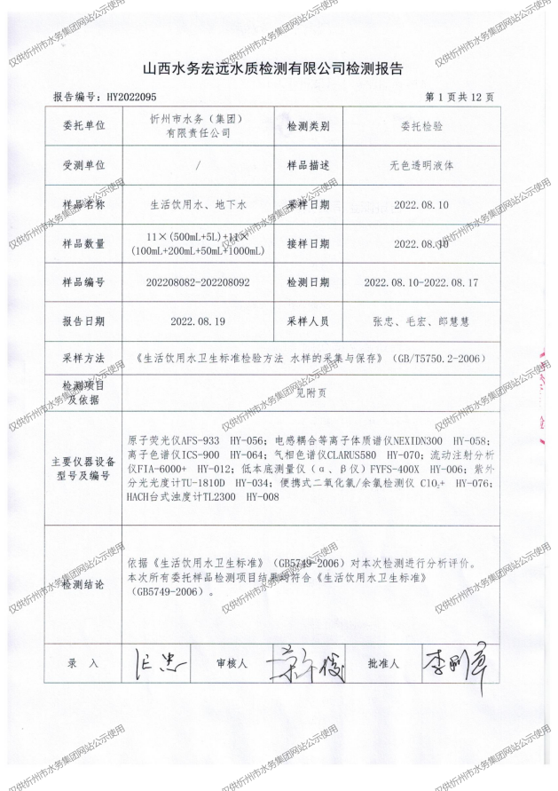 忻州城區公共供水水源水、出廠水、管網水、管網末梢水2022年8月份水質信息公示
