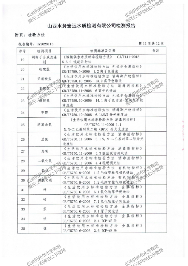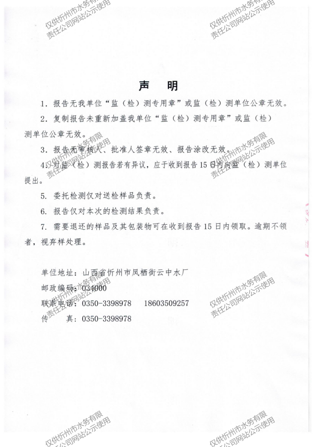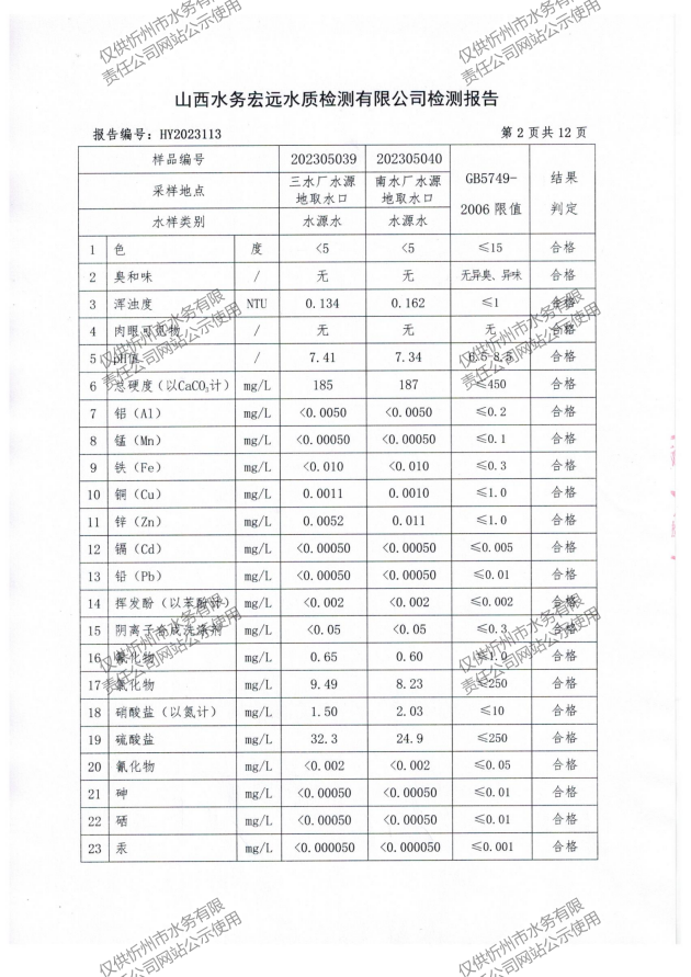 忻州城區公共供水水源水、出廠水、管網水、管網末梢水2023年5月份水質信息公示