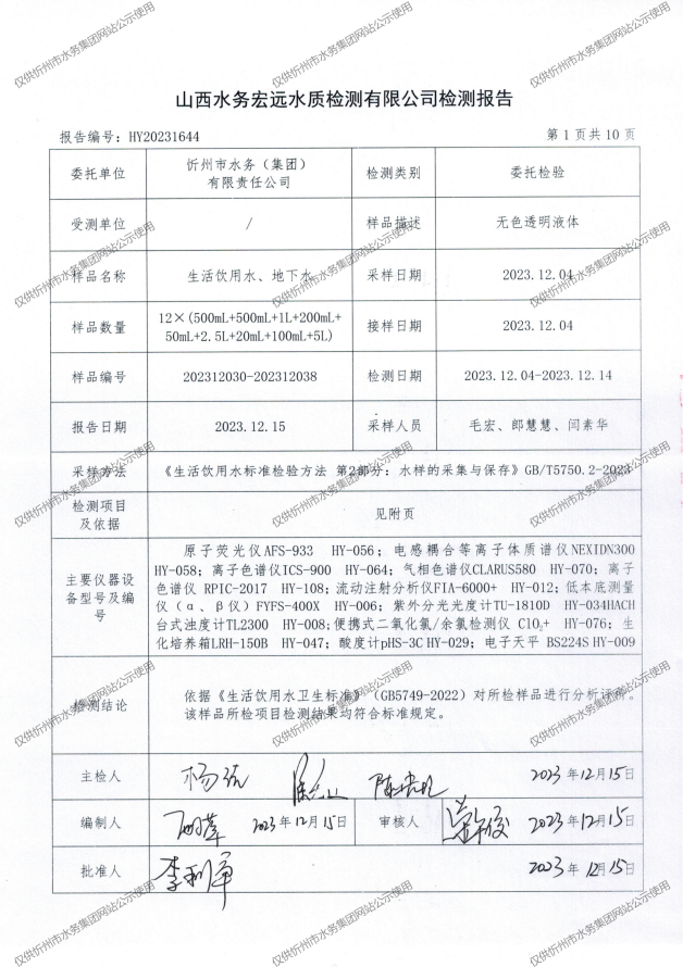 忻州城區公共供水水源水、出廠水、管網水、管網末梢水2023年12月份水質信息公示
