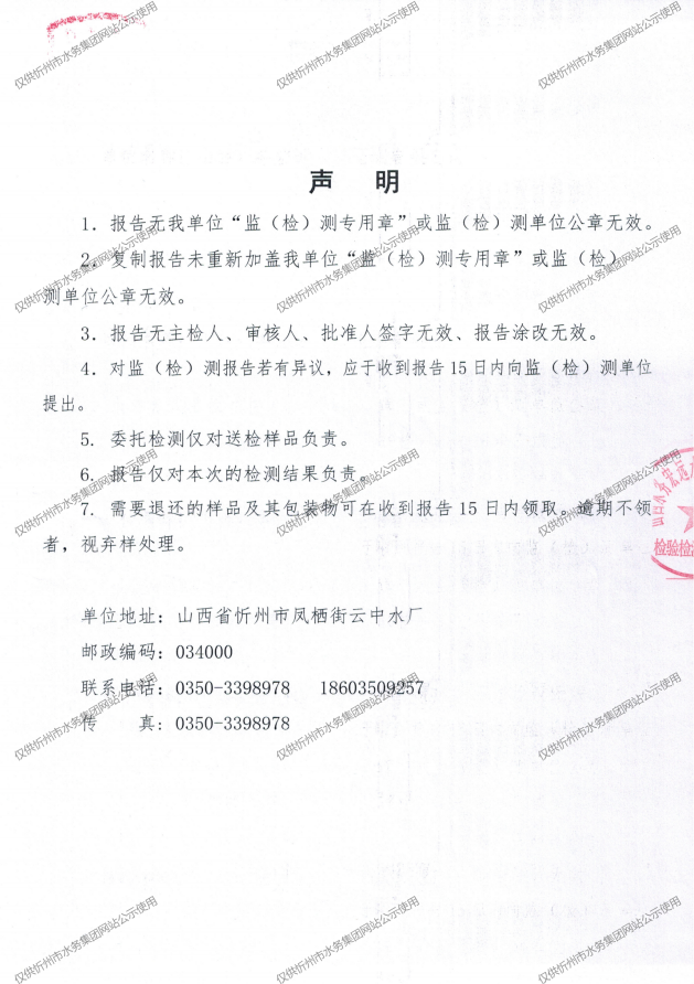 忻州城區公共供水水源水、出廠水、管網水、管網末梢水2024年4月份水質信息公示